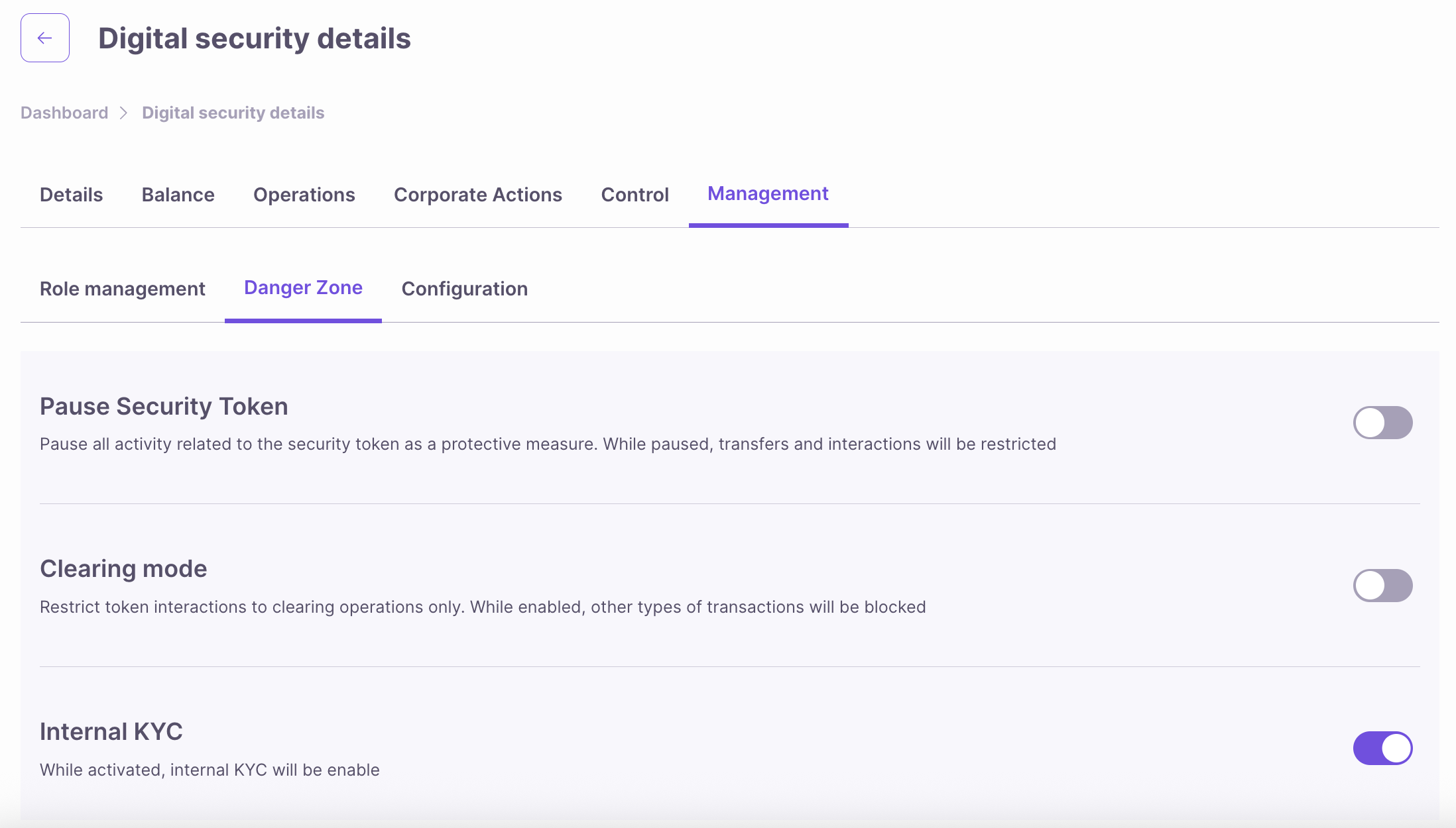 - Role Management: Enables the assignment and management of roles (e.g., Admin, Minter, Controller) for specific users, determining their permissions and access to various operations within the digital security.