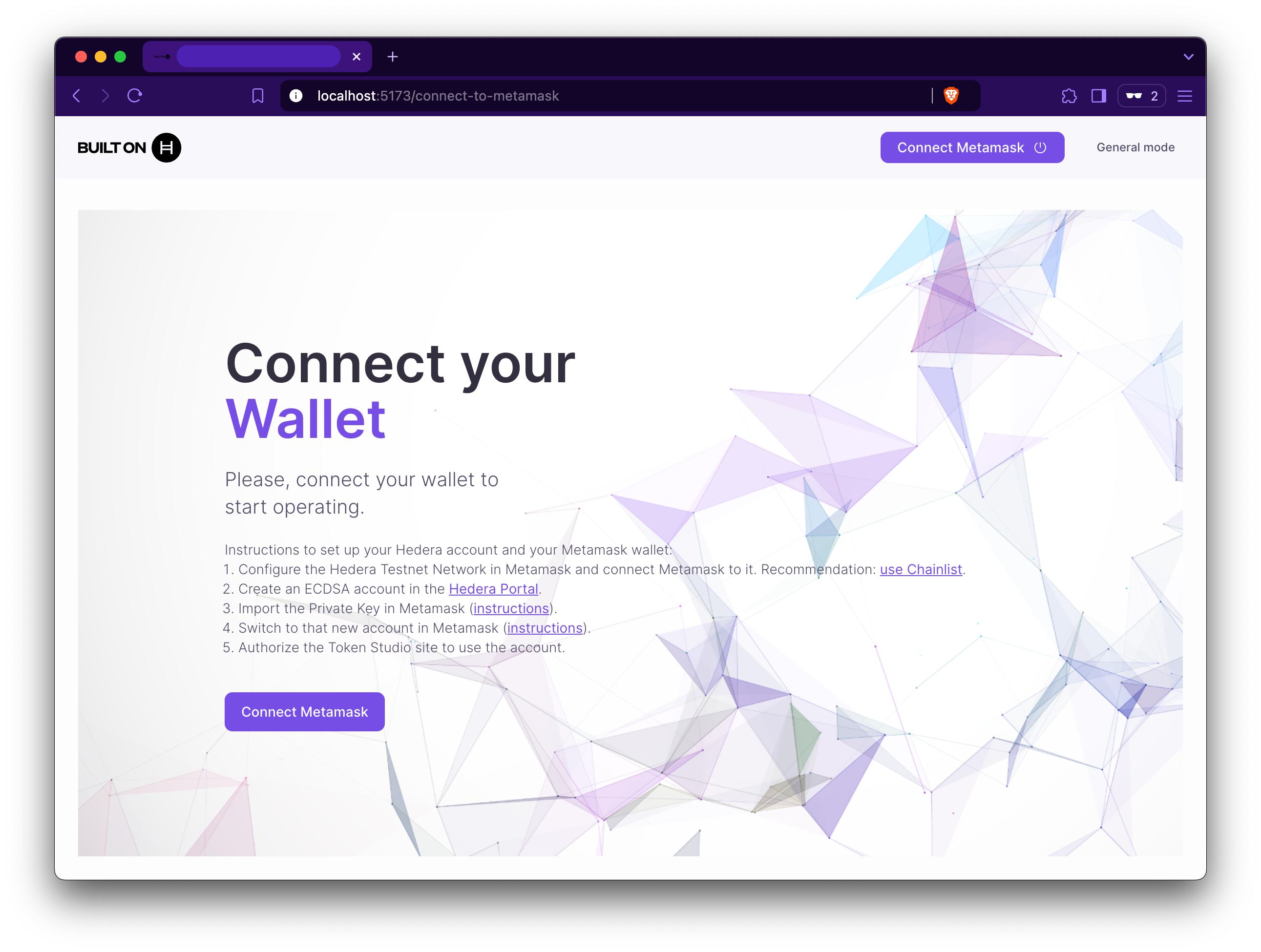 To interact with the demo, you will need to first set up a Hedera Testnet account with testnet HBAR. After setting up an account, head to the interactive demo site (tokenization-studio.hedera.com) and connect your wallet:
