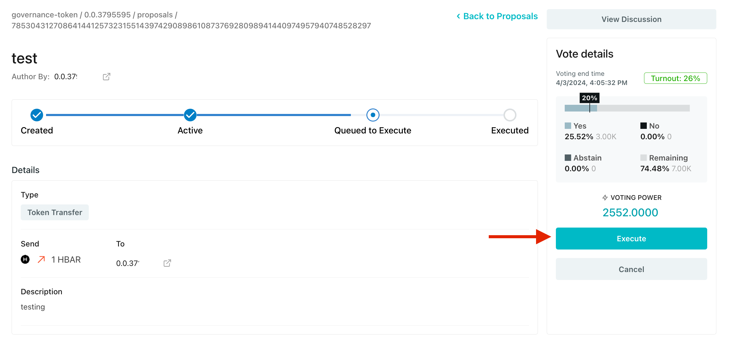 After the voting period ends, click on a proposal that passed under the Proposals tab and click Execute.