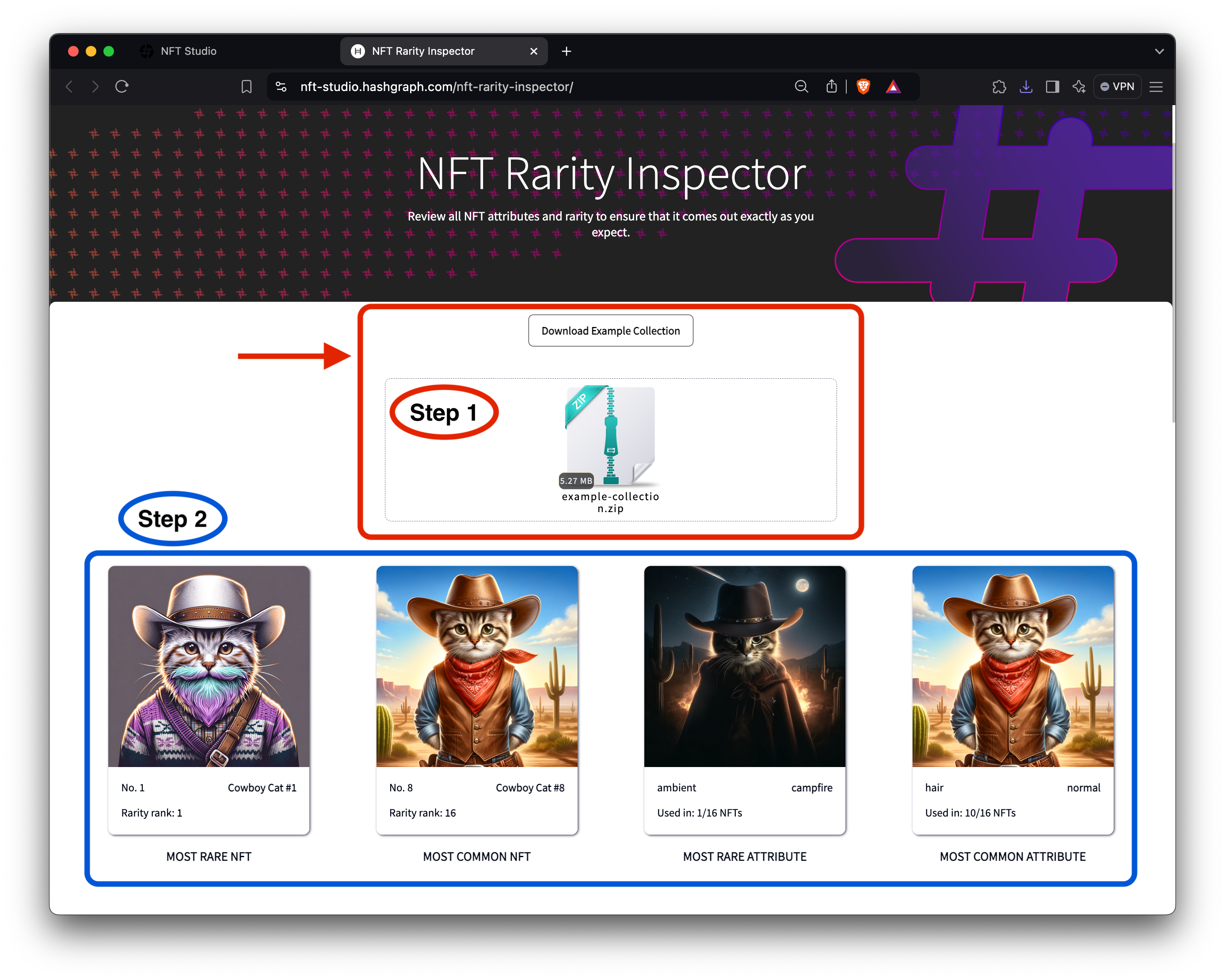 To follow along, download the example NFT collection.zip file from the Rarity Inspector web app. Once downloaded, upload the collection to the tool.
