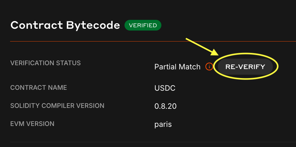 If your verification is successful, the verifier will return either a Full Match or Partial Match status. Let’s review each verification status and what they mean:- Full Match: Indicates the bytecode is a full (perfect) match, including all the metadata. The contract source code and metadata settings are identical to the deployed version.