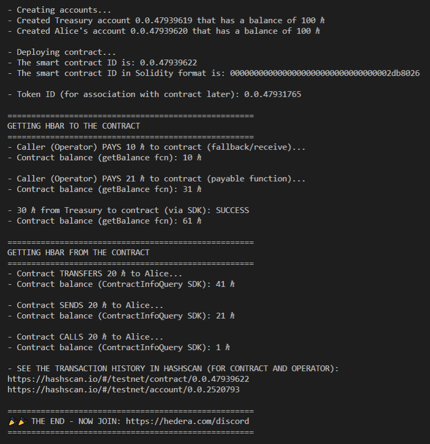 This example involves 3 Hedera accounts, 1 contract, and 1 Hedera Token Service (HTS) token. The Operator account (your Testnet account credentials) is used to build the Hedera client to submit transactions to the Hedera network – that’s the first account. The Treasury and Alice are new accounts (created by the Operator) to represent additional parties in your test – those are the second and third accounts respectively. A portion of the application file (index.js) and the entire Solidity contract (hbarToAndFromContract.sol) are shown in the tabs below. The Solidity file has functions for getting HBAR to the contract (receive, fallback, tokenAssociate), getting HBAR from the contract (transferHbar, sendHbar, callHbar), and checking the HBAR balance of the contract (getBalance). This portion of index.js configures and creates the accounts, deploys the contract, and stores the HTS token ID. The functions accountCreatorFcn and contractDeployFcn create new accounts and deploy the contract to the network, respectively. These functions simplify the account creation and contract deployment process and are reusable in case you need them in the future. This modular approach is used throughout the tutorial.Console Output ✅